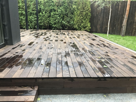 После согласования деталей с заказчиком, остановили выбор на доске из термоясеня от компании Thermory. Термически обработанная древесина подходит для применения в любых погодных условиях, не требует дополнительной обработки. Натуральная деревянная фактура гармонично вписалась в ландшафтные особенности участка.